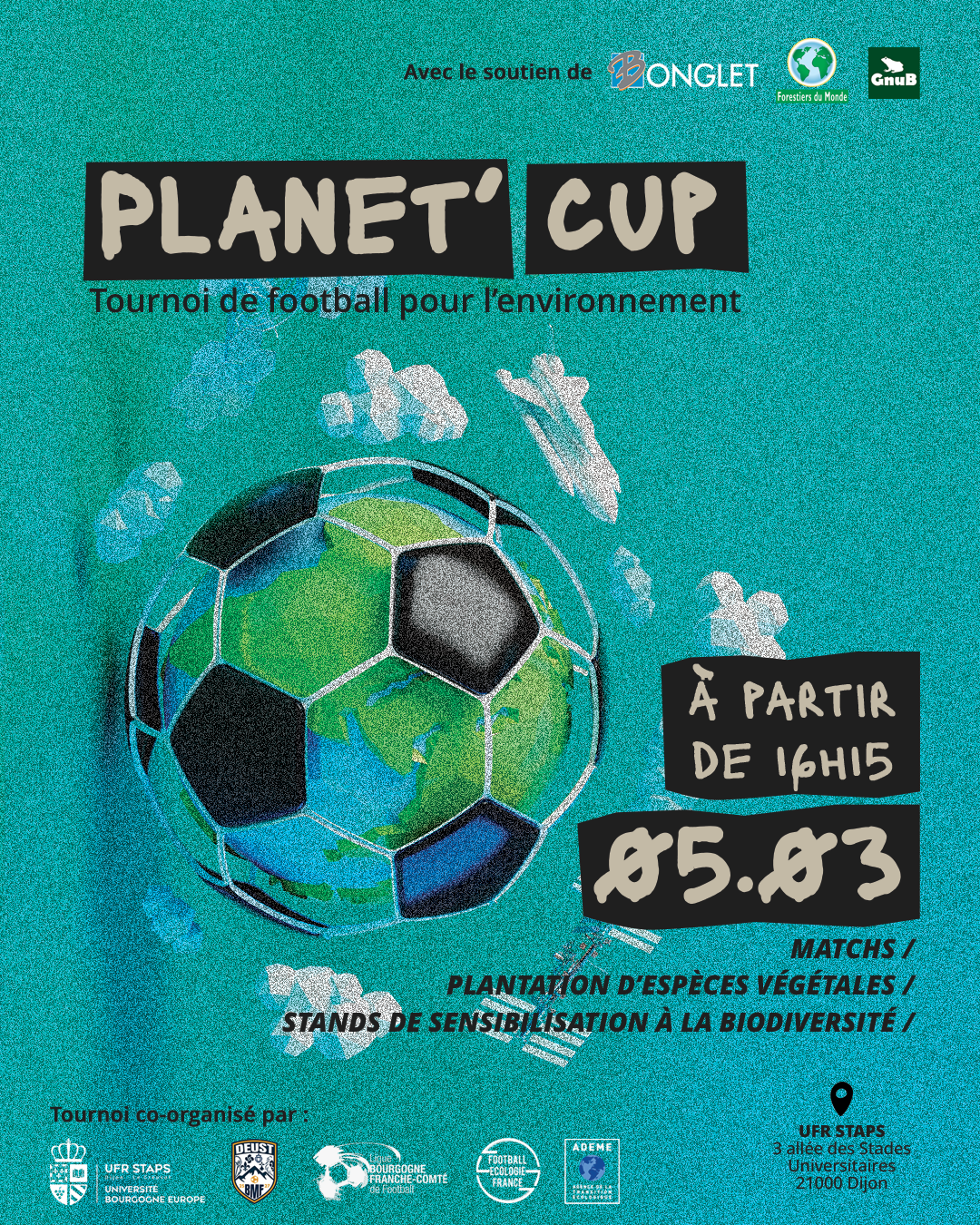 Organisée sur le site de l’UFR STAPS DIJON–Le Creusot en partenariat avec la Ligue Bourgogne-Franche-Comté de Football, Football Ecologie France et l’entreprise BONGLET, cette initiative a réuni étudiants, jeunes footballeurs et partenaires dont autour d’un objectif commun : agir concrètement pour l’environnement.