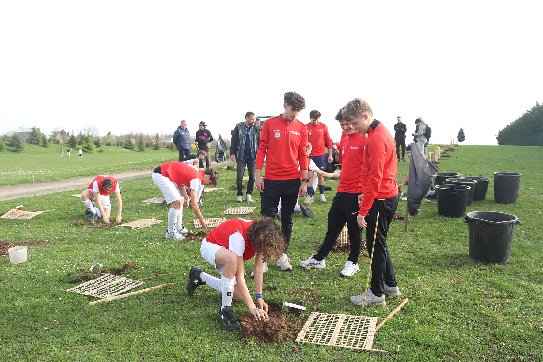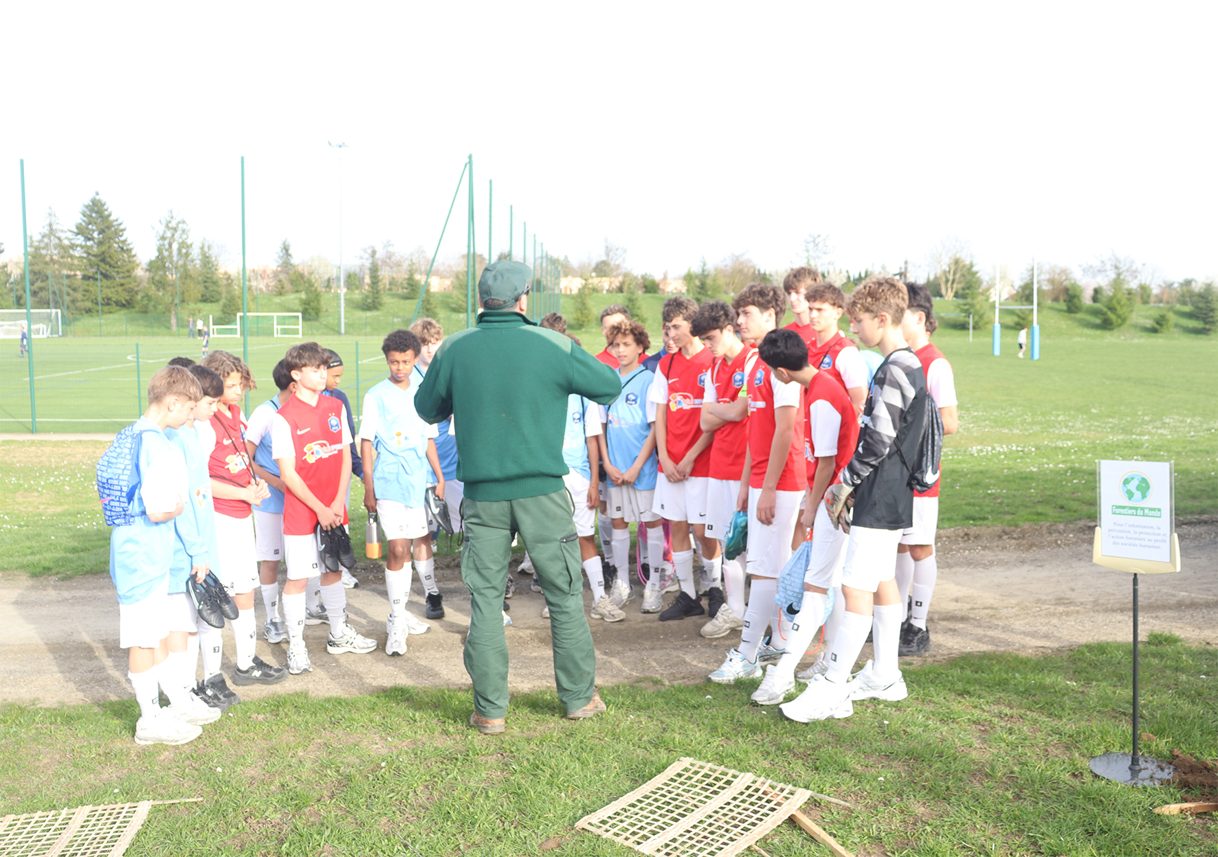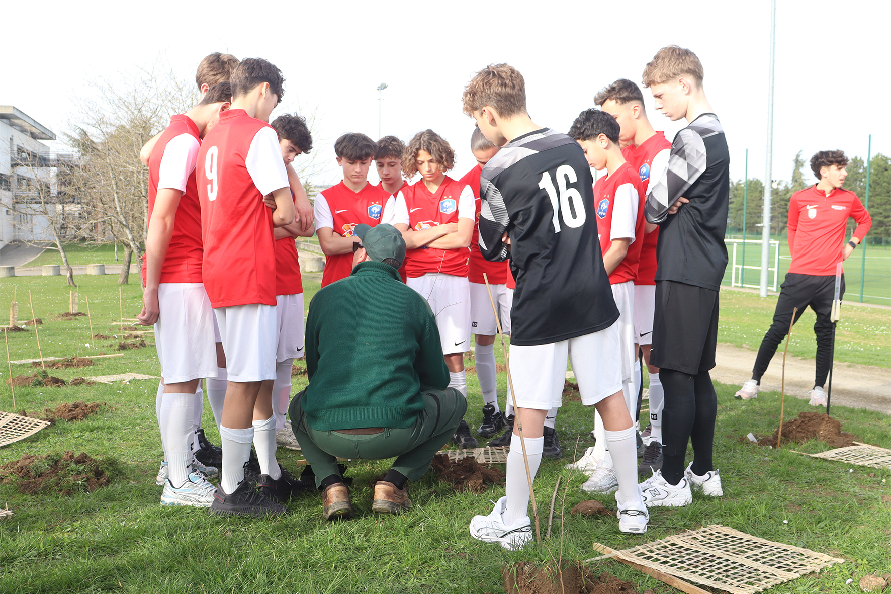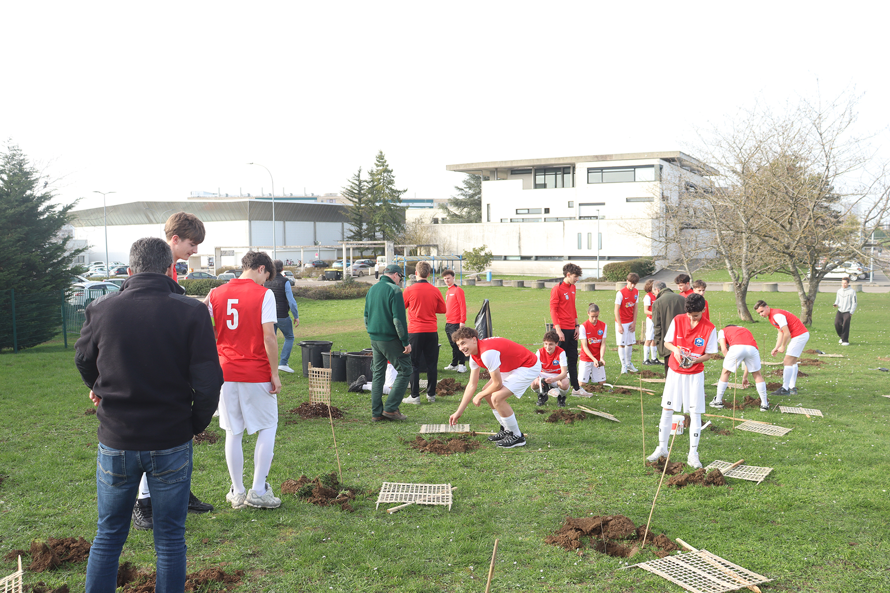 Tout au long de l’après-midi, les étudiants du DEUST spécialité Animation du football et les jeunes joueurs du pôle espoir ont participé à la plantation d’un bosquet composé d’une centaine d’essences forestières variées près des terrains de sport. Entre les matchs, chacun a pu mettre la main à la terre : préparation du terrain, plantation des plants et protection des jeunes arbres provenant de la SA PEPINIERES NAUDET🌳.